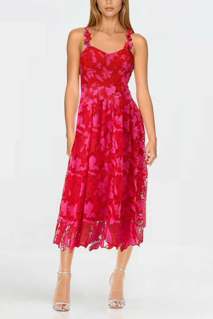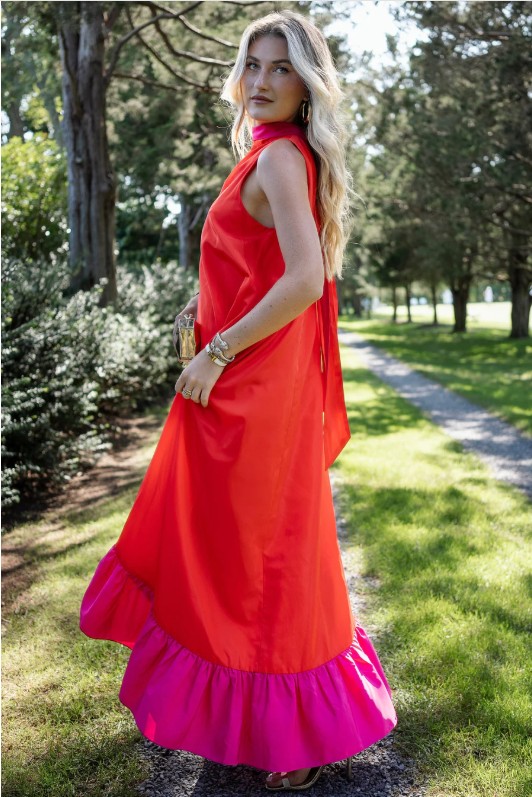 Make a bold statement with this dramatic taffeta gown. Featuring a mock neckline, flowing high-low hem, vibrant fuchsia ruffles, and halter tie sash, it’s all confidence and color. Available in 9 stunning colorways.