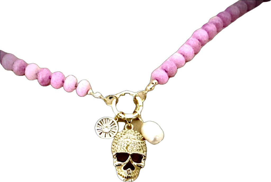 Strung with soft pink stones and finished with a gold-toned skull, radiant medallion, and pearl charm. Edgy meets elegant. The oversized gold clasp pulls it all together.